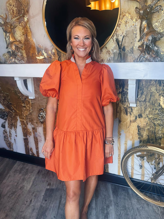 Puff Sleeve V-Neck Dress In Rust