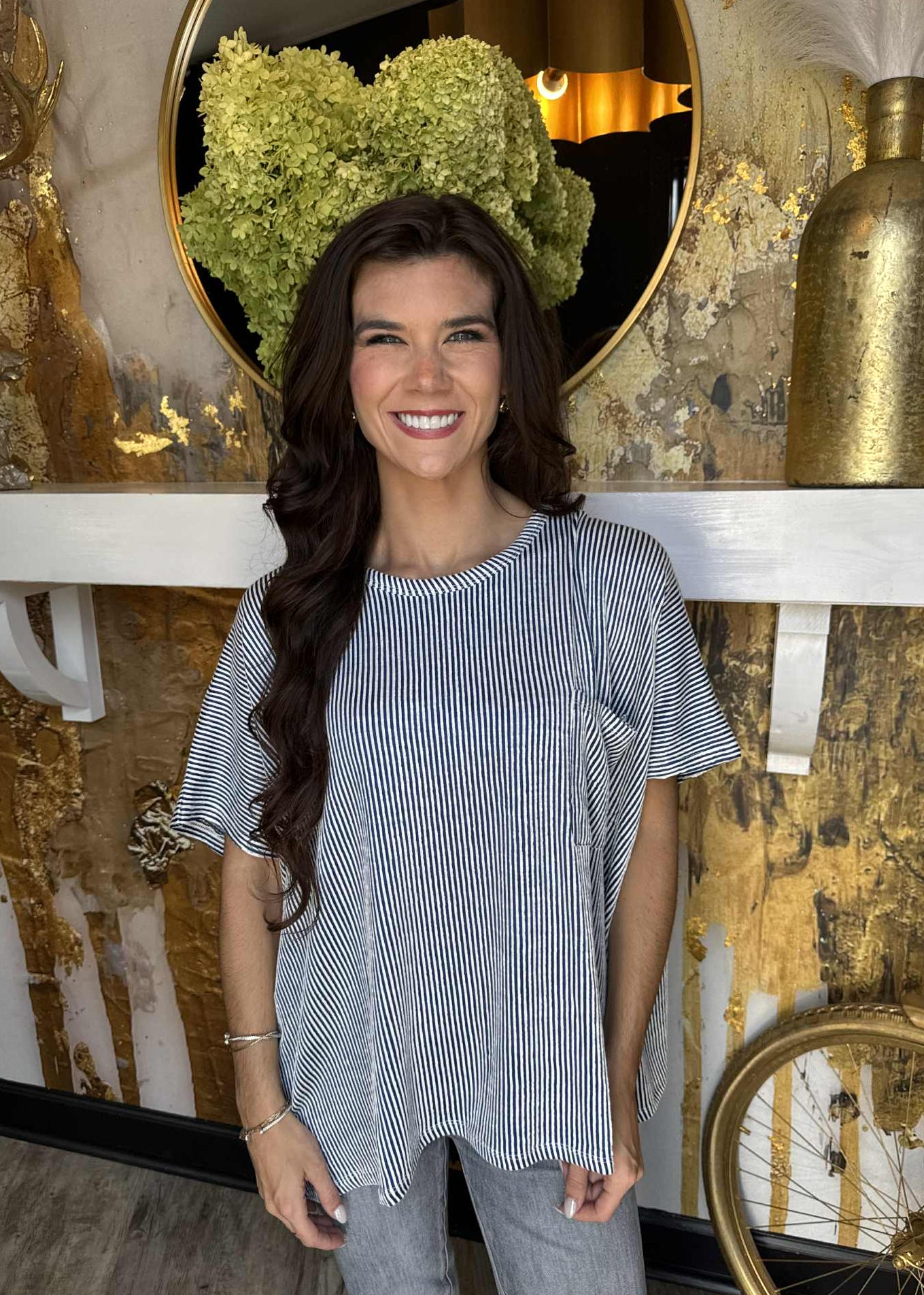 Light Navy Corded Rib Oversized Short Sleeve Top